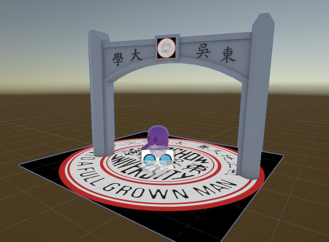 東吳校門模型、東吳校徽底圖、背景音樂、開始對話按鈕呼叫對話(我不想努力了,但位置沒調好+空間不夠,字沒有全部出來)